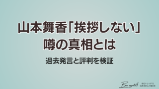 俳優・アーティスト 山本舞香『挨拶しない』噂の真相…過去発言と評判を徹底検証 山本舞香さんにまつわる「挨拶しない」「態度が悪い」という噂は本当でしょうか。報道・放送でのエピソードとご本人の発言を突き合わせ、事実関係と背景を整理します。 2025.09.21 俳優・アーティスト
